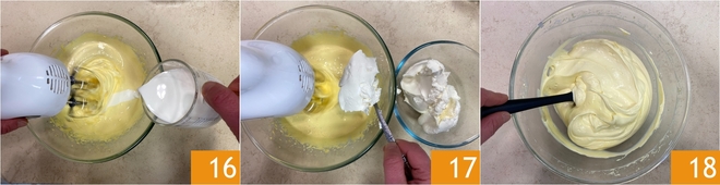 Incorporez maintenant la crème fraîche 16 et le mascarpone, une cuillerée à la fois 17. La crème est prête lorsque tous les ingrédients sont bien amalgamés 18.