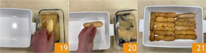 Préparez le café avec la cafetière moka et laissez-le refroidir. Vous pouvez maintenant composer votre tiramisu : prenez un plat, trempez les biscuits à la cuillère dans le café 19 et placez-les au fond 20 pour créer une première couche 21.