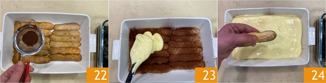 Saupoudrez d'une fine couche de cacao amer en poudre 22, puis répartissez la moitié de la crème 23. Composez maintenant la deuxième couche : disposez les biscuits à la cuillère trempés dans le café 24.