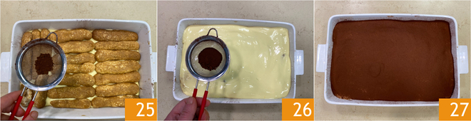 Saupoudrez de cacao 25 et répartissez le reste de la crème de manière uniforme. Terminez en couvrant d'une abondante couche de cacao 26. Laissez le tiramisu sans gluten prendre au moins une heure au réfrigérateur avant de le servir 27!