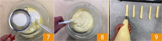 Tamisez maintenant les poudres peu à peu dans le bol : la farine de riz, la fécule de pommes de terre 7, l'amidon de maïs, la levure chimique et la xanthane. Remuez à nouveau délicatement de bas en haut jusqu'à obtenir un mélange homogène 8. Transférez la pâte dans une poche à douille avec une douille lisse de 12 mm de diamètre et formez des bâtonnets d'environ 10-12 cm de long sur une plaque beurrée et recouverte de papier sulfurisé 9.