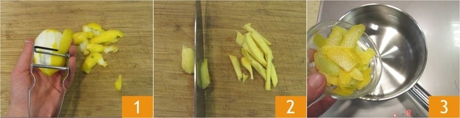 Pour préparer la tisane au gingembre et au citron, commencez par bien laver le citron et retirez l’écorce avec un économe, en veillant à ne pas prendre la partie blanche 1. Épluchez également la racine de gingembre et réduisez la pulpe en bâtonnets (30 g) : il vous faudra environ 30 g de gingembre épluché. Versez l’eau dans une petite casserole et ajoutez les écorces de citron 3.