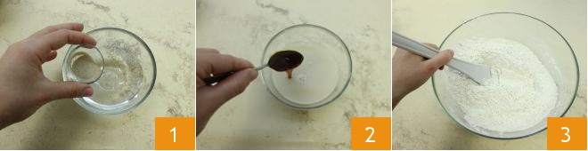 Pour préparer les toasts aux figues et noix au Battelmatt, commencez par la pâte du Pain de seigle. Dans un petit bol avec 200 g d'eau tiède, dissolvez la levure de bière sèche 1, ajoutez ensuite le malt et mélangez encore 2. Dans un bol plus grand, mélangez la farine de seigle et la manitoba avec une cuillère 3.