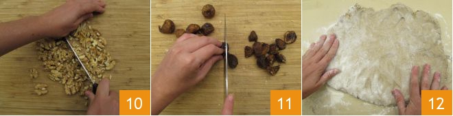 Lorsque la pâte est prête, hachez au couteau les cerneaux de noix 10 et hachez grossièrement les figues sèches 11. Sur le plan de travail légèrement fariné, étalez la pâte à la main pour obtenir un grand rectangle 12.