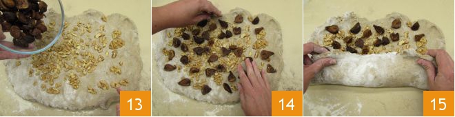 Parsemez les fruits secs 13 et répartissez-les au mieux avec les doigts 14. Commencez à replier la pâte en soulevant les bords et en les portant au centre 15.