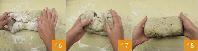 Pour que les fruits se mélangent à la pâte, continuez à replier 16, en répétant autant de fois que nécessaire 17. Formez ensuite un boudin de la taille du moule de 26x10 cm recouvert de papier sulfurisé 18.