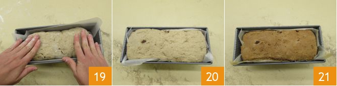 Installez-le bien à l'intérieur 19 puis couvrez avec du film plastique, laissez lever pendant environ 3 heures, ou jusqu'à ce qu'il ait doublé de volume 20. Procédez à la cuisson au four statique, déjà chaud à 220°, pendant environ 35 minutes. Une fois prêt, laissez refroidir complètement 21.