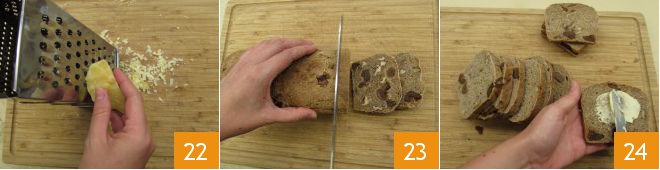 Râpez le Battelmatt avec une râpe à gros trous 22. Avec un couteau à dents, découpez 8 tranches épaisses de pain (environ 1 cm) 23 puis beurrez d'un seul côté toutes les tranches 24.