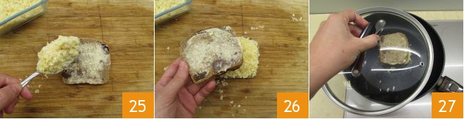 Sur la première tranche de pain avec le côté beurré, ajoutez le fromage 25, puis couvrez avec une autre tranche de pain, cette fois en orientant vers le haut la partie beurrée 26. Faites chauffer une poêle anti-adhésive et dorez le pain pendant 2 minutes en couvrant avec le couvercle 27,