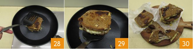 après le temps écoulé, pressez un peu et tournez, puis répétez la cuisson pour le même temps 28. Dès que le premier est prêt 29, continuez la cuisson de tous les autres toasts aux figues et noix au Battelmatt et dégustez-les fondants et chauds 30.