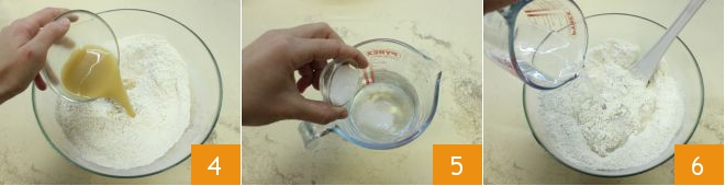 Ensuite, ajoutez le mélange 4 puis dissolvez le sel dans la partie restante d'eau tiède 5 et versez-la également en filet tout en mélangeant avec la cuillère 6.