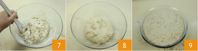 Continuez de mélanger 7 jusqu'à obtenir une pâte homogène 8. Puis couvrez-la avec du film plastique et laissez lever pendant une heure ou jusqu'à ce qu'elle ait doublé de volume 9.