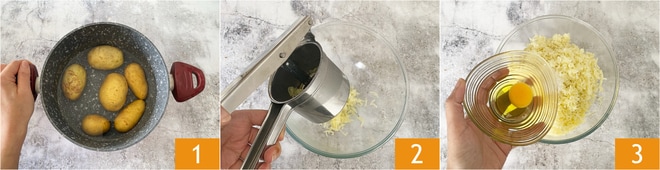 Pour réaliser le toast de pommes de terre à la pizzaiola, commencez par laver les pommes de terre sous l'eau courante et mettez-les dans une grande casserole d'eau. Faites-les cuire pendant environ 35 minutes 1. Lorsqu'elles sont tendres, retirez-les du feu et laissez-les tiédir. Épluchez les pommes de terre, passez-les au presse-purée et récupérez la purée dans un bol 2. Ajoutez l'œuf 3 au mélange.