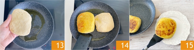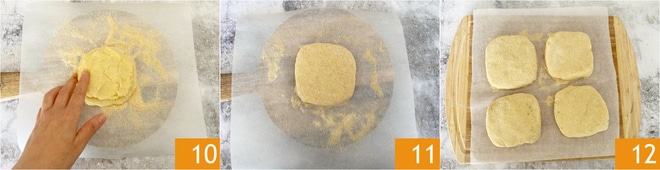 Refermez la garniture 10 toujours avec une quantité de pâte de pommes de terre (toujours 80 g) et donnez à nouveau une forme carrée avec les mains 11. Avec les quantités indiquées, vous obtiendrez 4 toasts 12.