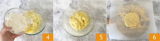 Ajoutez également le sel et la farine 00 4. Mélangez le tout jusqu'à obtenir une pâte souple et facile à travailler 5. Placez une feuille de papier sulfurisé sur un plan de travail et saupoudrez-la de chapelure. Prélevez une quantité de pâte (80 g) et placez-la sur la feuille de papier sulfurisé, donnez-lui une forme carrée avec les mains 6.