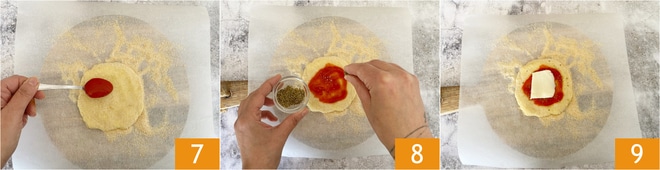 Déposez au centre une cuillère à café de coulis de tomate 7, l'origan, le basilic et une tranche de mozzarella bien égouttée et séchée 9.
