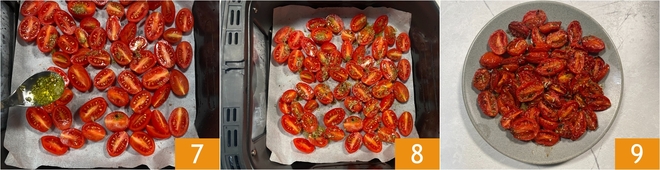 Disposez les tomates cerises dans le panier de la friteuse à air tapissé de papier sulfurisé (nous avons utilisé une friteuse d'une capacité de 6 L) en faisant attention de ne pas les superposer, puis assaisonnez-les avec l'huile aromatisée 7. Faites cuire à 180°C pendant 10 minutes, en remuant après les 8 premières minutes 8. Après ce temps, vos tomates cerises confites sont prêtes à être servies encore chaudes 9 !<\/p>
