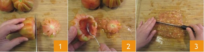 Pour préparer les tomates farcies à la viande, commencez par laver les tomates, coupez les chapeaux supérieurs en laissant une épaisseur d'environ 2 cm 1 et mettez‑les de côté. Videz l'intérieur des tomates à l'aide d'une petite cuillère 2 et hachez finement la chair retirée 3.