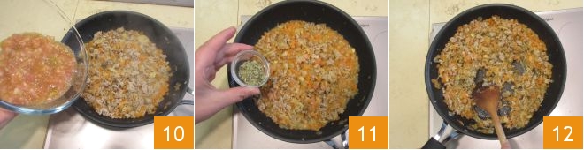 puis ajoutez la chair de tomate hachée 10, baissez le feu et laissez cuire pendant 5–6 minutes. Pour finir, parfumez avec l'origan 11, salez, poivrez et coupez le feu 12.