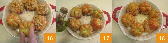 couvrez‑les avec les chapeaux que vous aviez mis de côté 16, ajoutez un autre filet d'huile sur le dessus 17 et enfournez dans un four statique préchauffé à 200 °C pendant 30 minutes, en plaçant le plat sur la grille du bas. Une fois cuits, vos tomates farcies à la viande sont prêtes à être servies bien chaudes 18 !