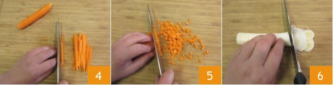 Épluchez les carottes et coupez‑les d'abord en fines lanières 4 puis en très petits dés 5. Enfin, enlevez les extrémités du poireau et coupez‑le en fines rondelles 6.