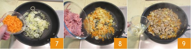 Prenez maintenant une poêle antiadhésive, versez environ 30 g d'huile prélevés sur la quantité totale et ajoutez le poireau et les carottes 7. Faites revenir à feu moyen‑vif pendant environ 4–5 minutes, puis incorporez la viande hachée 8 et faites‑la dorer pendant environ 3 minutes. À ce stade, déglacez avec le vin blanc 9 et laissez‑le s'évaporer complètement,