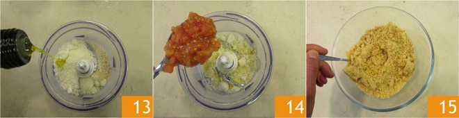 Enfin, versez l'huile 13 et la pulpe de tomates égouttée 14, mixez le tout jusqu'à obtenir une panure homogène 15.