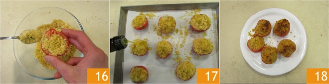 Remplissez chaque moitié de tomate avec la farce obtenue 16, disposez les tomates sur une plaque recouverte de papier cuisson, huilez légèrement les tomates 17. Faites cuire au four ventilé à 200° pendant 10-12 minutes, ou jusqu'à dorure. Servez les tomates gratinées chaudes 18.