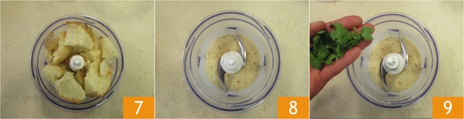 Coupez grossièrement le pain rassis 7 avant de le mixer 8. Ajoutez le persil 9.