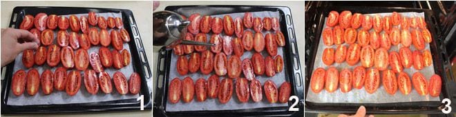 Pour préparer les tomates séchées à l'huile, lavez et coupez les tomates en deux dans le sens de la longueur. Disposez-les soigneusement sur une plaque recouverte de papier sulfurisé 1 et saupoudrez-les d'un peu de sel, de sucre et d'un filet d'huile 2. Laissez-les dans un four statique à 120 degrés pendant 8 à 10 heures 3. Une plaque peut contenir environ 1 kg de tomates. Il est possible de cuire simultanément deux plaques en prenant soin de les alterner pendant la cuisson des tomates.