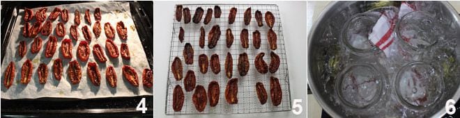 Vérifiez de temps en temps et retirez du four celles qui se dessèchent avant les autres 4. Une fois sèches, sortez-les du four et laissez-les refroidir sur une grille 5. Pendant que les tomates refroidissent, procédez à la stérilisation des bocaux et des couvercles, comme indiqué dans les lignes directrices du Ministère de la Santé mentionnées à la fin de la recette.