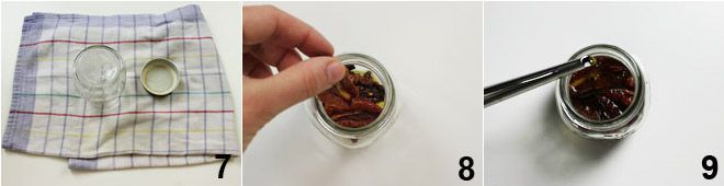Laissez sécher les bocaux sur un torchon propre 7. Mettez les tomates séchées en pot en les disposant par couches, ajoutez un peu d'huile d'olive extra vierge et pressez-les légèrement 8. Continuez avec les couches et enfin recouvrez-les complètement d'huile 9, en prenant soin de laisser 2 centimètres d'espace du bord du bocal. Si des bulles d'air se sont formées à l'intérieur, remuez légèrement le bocal pour les faire sortir : l'huile doit se répartir uniformément dans le bocal. Placez le presseur pour maintenir les tomates en place. Si vous utilisez des bocaux à couvercle vissé, vissez bien mais sans trop serrer. Passez ensuite à l'ébullition des bocaux, c'est-à-dire à la pasteurisation, en suivant les indications des lignes directrices du Ministère de la Santé citées à la fin de la recette. Si vous utilisez des bocaux avec des couvercles à vis, une fois que les bocaux ont refroidi, vérifiez si le vide d'air a bien été réalisé : vous pouvez appuyer au centre du couvercle et, si vous n'entendez pas le "clic-clac" classique, le vide d'air a été réalisé. Si après la rebouillie, vous remarquez la formation de petites bulles d'air, lorsque le bocal est encore chaud, tapez-le délicatement sur une surface pour que les bulles remontent à la surface et disparaissent naturellement. Si vous utilisez des bocaux avec des fermetures à joint en caoutchouc, au moment de consommer les tomates à l'huile, vous pouvez faire le test du vide en tirant sur la languette : si elle produit un bruit sec, cela signifie que le contenu a été conservé avec le bon vide. À l'inverse, si en tirant la languette, le joint est "mou", cela signifie que le vide n'a pas été correctement créé et il est préférable de ne pas consommer le contenu.