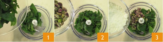 Pour réaliser la tommette au BBQ avec légumes grillés et moutarde, commencez par préparer le pesto : lavez et séchez les feuilles de basilic et de menthe, puis placez-les dans un mixeur 1 avec les pistaches 2 et le Parmigiano râpé 3.