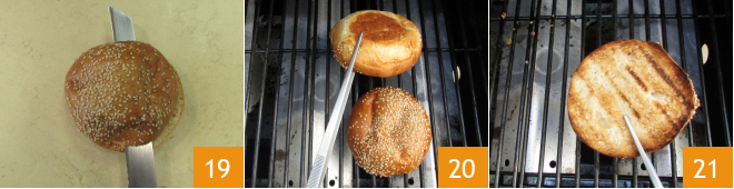Pendant ce temps, coupez les pains en deux 19 et placez-les sur le grill avec le côté coupé vers le bas 20 jusqu'à ce qu'ils soient légèrement grillés 21.
