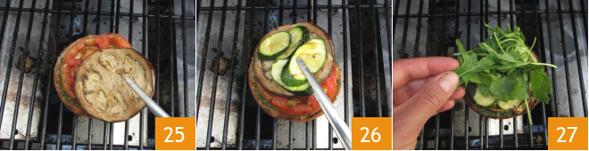 Ajoutez également une tranche d'aubergine 25 et des courgettes 26, puis complétez avec quelques feuilles de roquette 27.