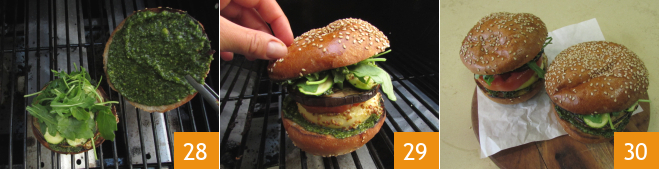 Recouvrez avec la moitié supérieure du pain tartinée de pesto 28 et appuyez légèrement 29. Assemblez de la même manière le deuxième sandwich et dégustez immédiatement votre tommette au BBQ avec légumes grillés et moutarde 30!