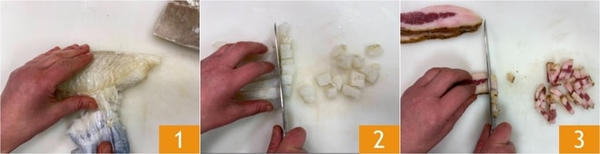 Pour préparer les tonnarelli à la gricia avec morue, commencez par retirer la peau de la morue déjà dessalée 1 et enlevez les éventuelles arêtes, puis découpez la chair en dés 2. Retirez la couenne de la joue de porc et réduisez-la en lanières 3.