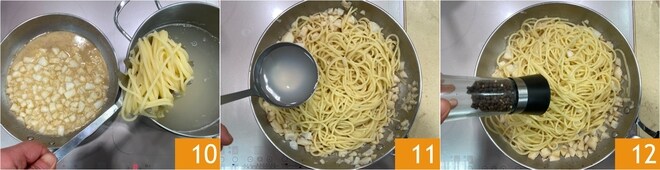 Égouttez les tonnarelli dans la poêle avec la morue 10, ajoutez une louche d'eau de cuisson 11, poivrez 12 et mélangez le tout à feu vif.