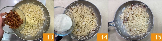 À ce stade, éteignez le feu et ajoutez presque toute la joue de porc croustillante 13 et presque tout le pecorino râpé 14. Ajoutez le fromage peu à peu et mélangez bien l'assaisonnement jusqu'à obtenir une consistance crémeuse 15, en ajoutant si nécessaire encore un peu d'eau de cuisson.