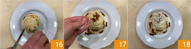 Dressez les tonnarelli ainsi assaisonnés 16 et complétez avec la joue de porc et le pecorino réservés 17. Un dernier tour de moulin à poivre et vos tonnarelli à la gricia avec morue sont prêts à être servis 18 !