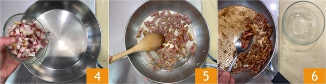 Versez la joue de porc dans une poêle bien chaude sans ajouter de matières grasses 4 et faites-la rissoler à feu moyen-vif en remuant souvent 5. Quand la joue de porc sera croustillante et dorée, transférez-la dans un bol en laissant le fond de cuisson dans la poêle 6.