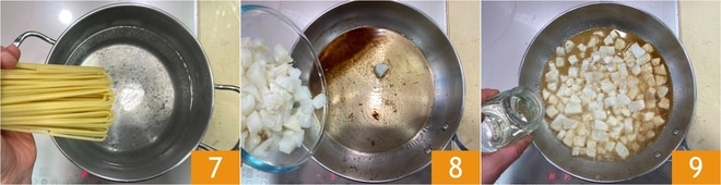 Entre-temps, portez à ébullition une casserole d'eau non salée et faites cuire les tonnarelli al dente 7. Pendant ce temps, versez la morue dans la poêle où vous avez cuit la joue de porc 8 et faites-la sauter pendant quelques minutes, en déglaceant avec le vin blanc 9.