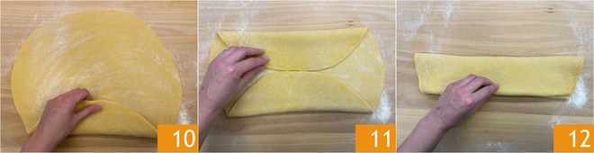 Lorsque les feuilles de pâte auront séché, saupoudrez très légèrement la surface de semoule et repliez-la sur elle-même : d'abord un bord 10, puis l'autre 11 et enfin fermez en faisant se rejoindre les deux bords 12.