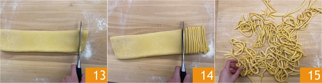 Découpez les tonnarelli en tranches en coupant le rouleau du côté le plus étroit avec un couteau bien aiguisé 13 à une épaisseur d'environ 2-3 mm 14. Une fois prêts, disposez les tonnarelli obtenus, bien espacés 15, sur un plateau recouvert d'un torchon sec et saupoudré de semoule.