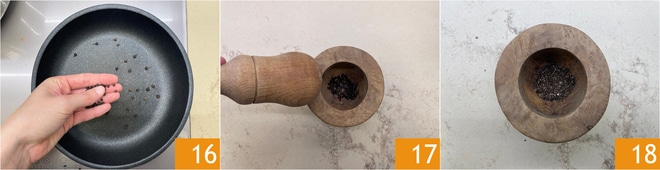 Passons à l'assaisonnement : dans une poêle légèrement chaude, faites griller à feu doux le mélange des deux poivres, le noir et celui de Cubèbe (si vous ne l'avez pas, vous pouvez l'omettre) 16. Lorsque de la poêle se dégagera une forte odeur de poivre, cela signifie que la torréfaction est bien avancée. Transférez-le dans un mortier 17 et réduisez-le à la texture que vous préférez : nous l'avons laissé assez grossier 18.