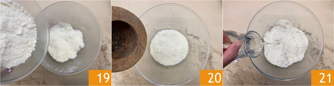 Dans un grand bol, versez le Pecorino romano râpé, ajoutez également le Parmigiano Reggiano DOP râpé 19, ajoutez le poivre 20 et l'eau froide 21.