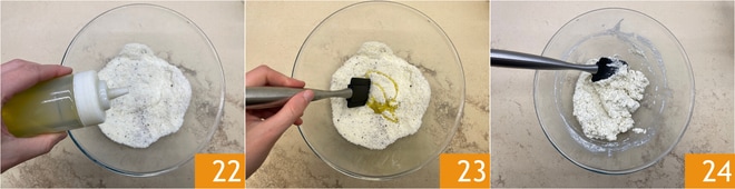 Avant de commencer à mélanger, ajoutez également un peu d'huile 22 (facultatif, cela sert à lustrer), puis remuez énergiquement 23 : vous devez obtenir un mélange homogène, crémeux mais pas liquide, avec une consistance presque comme celle du mortier 24.