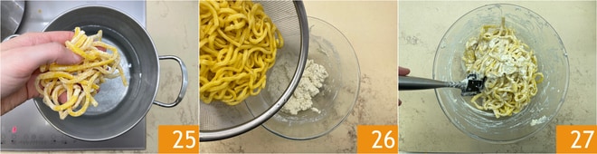 Portez de l'eau à ébullition, salez à votre convenance et faites cuire les tonnarelli frais 25, pendant environ 7 minutes. Égouttez-les et versez-les directement dans le bol 26, puis mélangez immédiatement très rapidement avec la spatule pour incorporer l'assaisonnement 27. Ajoutez un peu d'eau de cuisson des pâtes si nécessaire, pour un résultat crémeux.