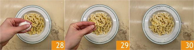 Il ne reste plus qu'à dresser, ajouter encore du Pecorino romano à votre goût 28, du poivre moulu 29 et les tonnarelli cacio et poivre sont prêts à être dévorés 30!