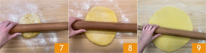 Pétrissez pendant environ 10 minutes 4, vous devez obtenir une pâte assez lisse et homogène 5. Enveloppez-la dans un film plastique et laissez reposer pendant au moins 30 minutes 6.